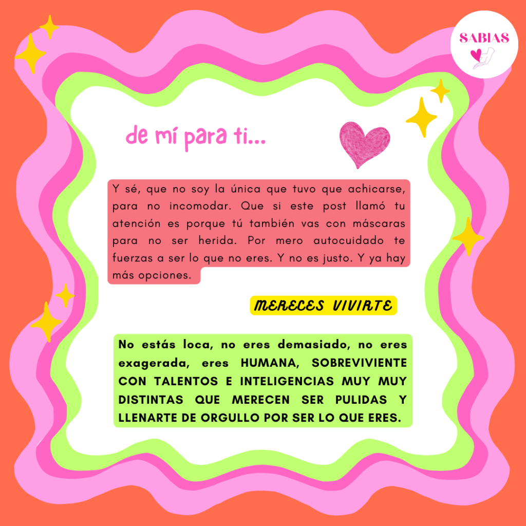 No estás loca, no eres demasiado, no eres exagerada, eres HUMANA, SOBREVIVIENTE CON TALENTOS E INTELIGENCIAS MUY MUY DISTINTAS QUE MERECEN SER PULIDAS Y LLENARTE DE ORGULLO POR SER LO QUE ERES.